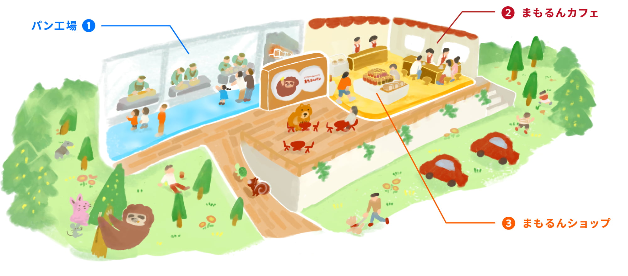パン工房や絵本が見学できる展示通路、パンやケーキ、レナートの防災グッズも販売する